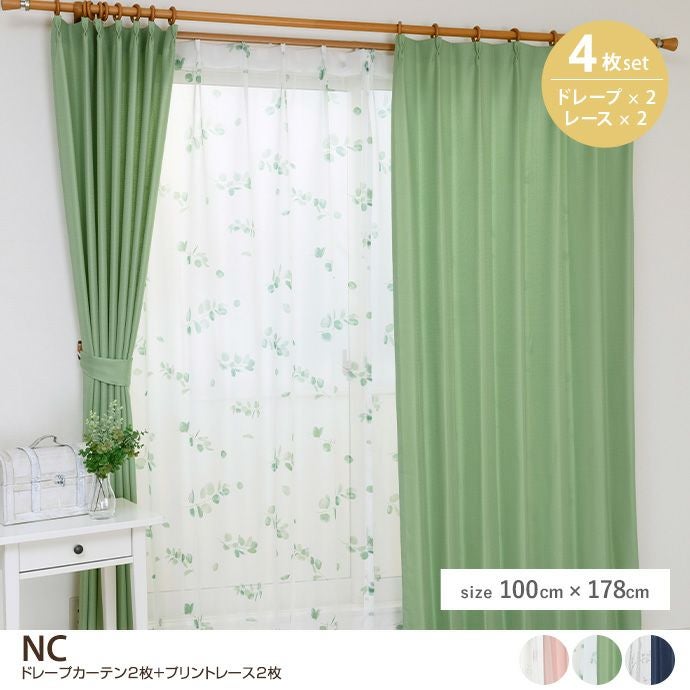 【4枚セット】NC ドレープカーテン2枚+プリントレース2枚 100cm×178cm
