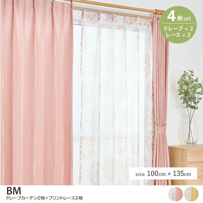 【4枚セット】BM ドレープカーテン2枚+プリントレース2枚 100cm×135cm