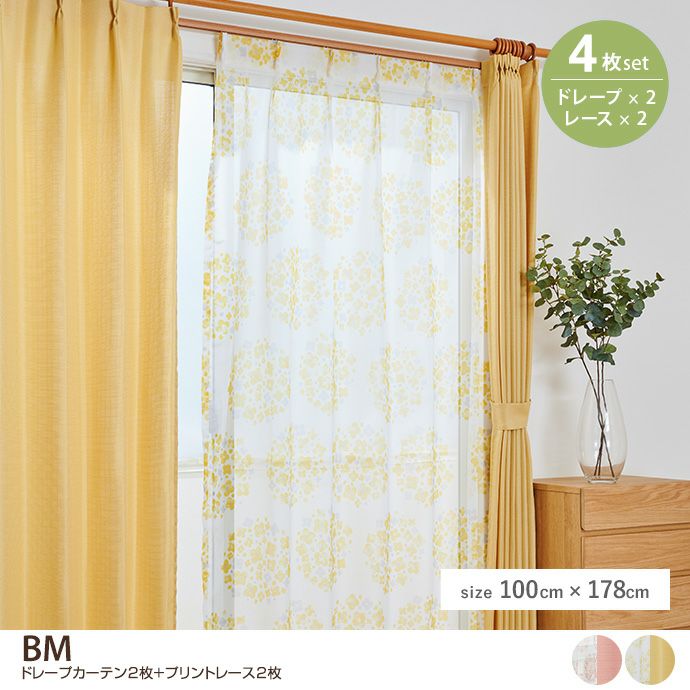 【4枚セット】BM ドレープカーテン2枚+プリントレース2枚 100cm×178cm