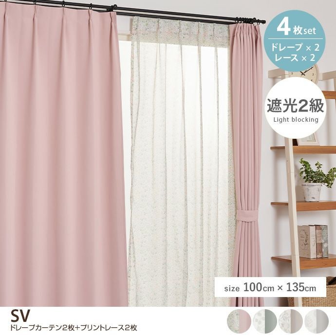 【4枚セット】SV ドレープカーテン2枚+プリントレース2枚 100cm×135cm