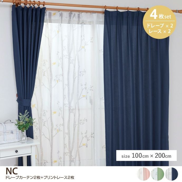 【4枚セット】NC ドレープカーテン2枚+プリントレース2枚 100cm×200cm