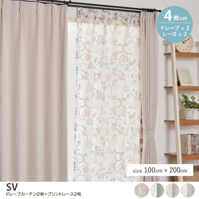 【4枚セット】SV ドレープカーテン2枚+プリントレース2枚 100cm×200cm